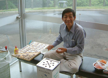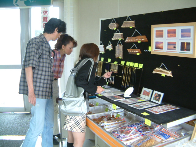 記念塔の管理人、研究家高山さん。 アクセサリーの素材探し、魚の美味しい干し方の開発と、常に研究の手を休めません。この時はホタテのアクセサリーを作成中でした。 |
