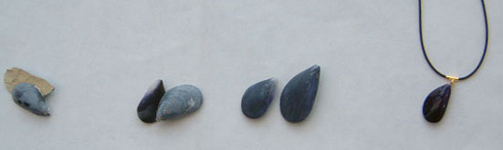 上は作成工程で、ムール貝を割って中にパテを詰め、磨き上げてニスを塗ります。