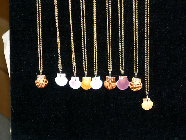 この日は霧がものすごかった。記念塔のすぐ近くに羊たちがいました。最近現れたそうです。 一階のお土産販売所では海産物、絵葉書などとともに高山さんが作った帆立貝、ムール貝のアクセサリーが売られています。帆立貝の稚貝のストラップ(\500)を自分用と友人のお土産に買いました。下はペンダント。この日、入り口にオコジョ(!)が現れました。突然なおかつ一瞬の出来事で写真に収めることはできませんでしたが、珍しい体験に皆で興奮しました。 |