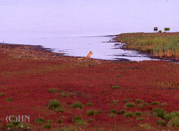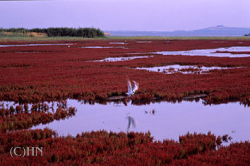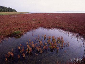 能取湖 9月に入って朝晩の涼しささが日増しに感じられるようになるころ、道東の水辺では湖岸の草が真っ赤に色づく。これがサンゴ草(本名アッケシソウ)であり、なかでも能取湖の卯原内付近には日本最大のサンゴ草群生地がある。 サンゴ草の本名アッケシソウは釧路厚岸(あっけし)湖のカキ島で初めて発見されたことからついた。 草丈10〜30pのアカザ科の草で、夏の間は黄緑色で7〜8月下旬に小さい花が3個ずつ集まって咲き、9月に紅葉する。
