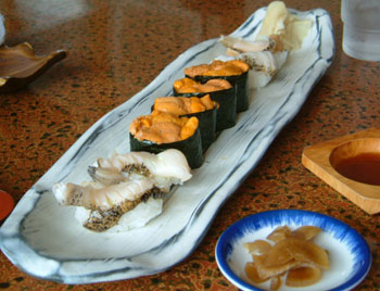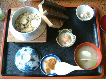 ホタテづくしは3日前に食べたので今日は初めてホタテ釜飯(\800)を頼みました(左上)。左はホタテフライ丼(\850)、上はウニとツブのお寿司です。今日は私にとって究極のランチになりました。 |