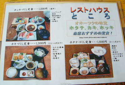 国道238号線から常呂川方面から進むと左側にこの看板が見えてきます。常呂町の'旬'を味わえる食堂。ホタテづくしや、ホタテの釜飯、そのほか新鮮な魚介類を堪能できます。