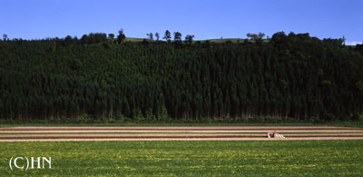 | 春耕は四月末から五月初旬。雪の生活が長かっただけにトラクターで起こした黒土が、あたたかく目に沁みる。 主な蒔付けはビート(砂糖大根)と馬鈴薯。蜂巣状に並んだ紙筒の中に、已に温床で芽生えたビートの苗を、機械力で広い畑に移植して行くのは、仲々に精巧で面白い作業である。 薯蒔きは、適当に切った種薯を特殊な容器で背負い、下に向いた筒先から一定の歩度で一つずつ落としてゆく。宿命を負うごとく、黒い畝を一日歩きつづける様は、しかし、ミレーの画を見るように美しい。 |