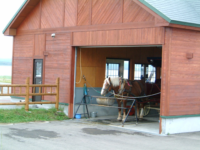 | うわさの馬車の馬です。暇そうにしていました。一度はのってみたいです。速いかナー。 | ![]() |