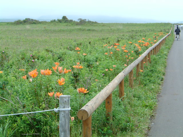 常呂町では6月中旬に強風が吹き、塩害がおこった関係で周囲の木々も茶色くなってしまっているものが多く見受けられました。ワッカの花々もそのとき咲いていたものは一斉にだめになってしまったそうですが今はまた回復してきているようです。所々でセンダイハギやエゾノスカシユリ、エゾカンゾウ、ミヤコグサの群生を見ることができました。 |
