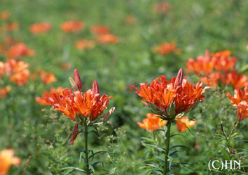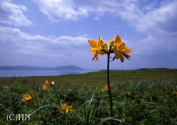 エゾゼンテイカ(蝦夷禅庭花) ユリ科6〜7月 エゾカンゾウ(蝦夷萓草)とも言う。6〜7月に咲く多年草で、朝開いた花は夕方にはしぼんでしまう一日花。 アイヌ語でkakukoku-nonno(カッコウ-花)などと呼び、カッコウが鳴くころにエゾカンゾウの花が咲き、川に鱒がのぼり始めると伝えられている。 |