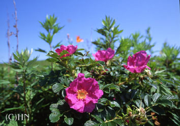 ハマナス(浜茄子・浜梨) バラ科・6〜10月 50から150cmの低木で、その実にはビタミンC が豊富に含まれており、ジャムなどに加工されている。ハマナスと言う名前の由来は、実が梨の味に似ているので「ハマナシ」だったのが訛って「ハマナス」になった、実の形が茄子に似ていた、など様々あるが、どちらにしろハマナスの実の様子から付けられた名前であることは間違いないようだ。アイヌの人たちも、はまなすの実を指してmawとよび、大切な食料源だったその名前は馬追(maw-o-i=ハマナスの実-群生する-所))など、今も地名に残されている。 |