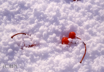 | ナナカマド(七竈) バラ科 落葉高木。 木は燃えにくく、7回かまどに入れても燃え残ることからその名がついた。7月に白い花を咲かせて秋に紅葉し、赤い実をつける。 アイヌの人たちは冬猟で暖をとるとき雪の上で焚き火をすると火が消えるのでナナカマドを敷き詰めたという。また、木の持つ臭気に魔をよける力を感じ、魔よけの木として用いていた。 |