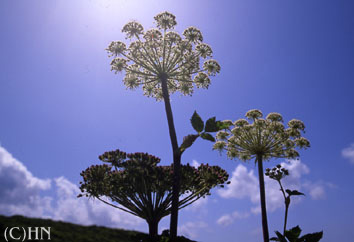 エゾノヨロイグサ(蝦夷鎧草) セリ科・6〜7月 高さは1〜2mにもなる。 エゾニュウやエゾシシウドと良く似ているが、エゾニュウより茎がやや細く紫色を帯び、エゾシシウドより葉にしわがないことで区別できる。 その根は鎮痛、鎮痛作用があり、漢方などに用いられる。 |